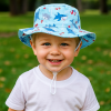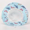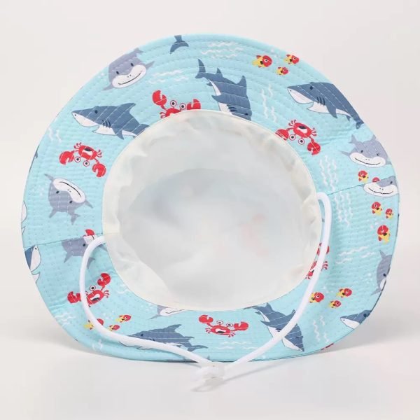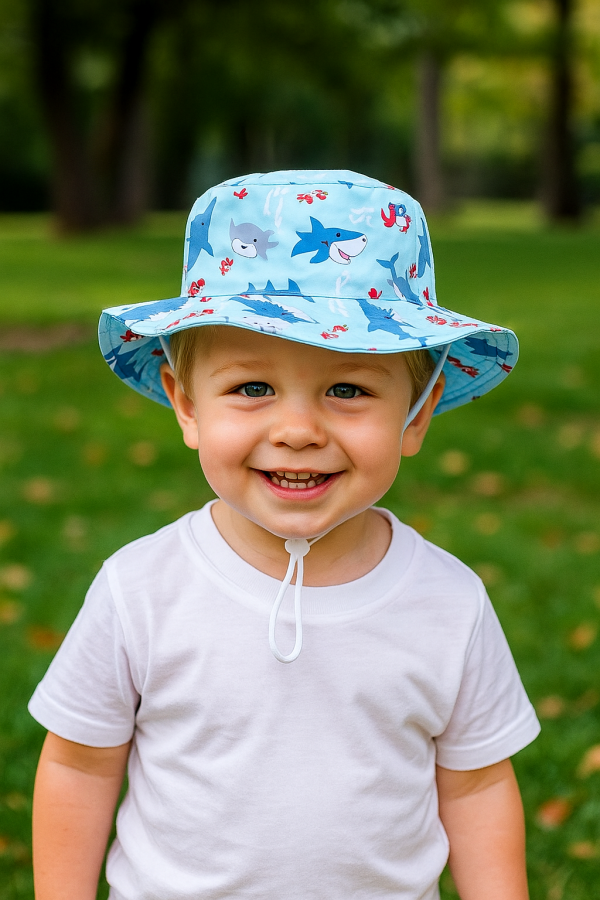 Make sunny days extra fun with this adorable kids’ shark-themed sun hat. Designed in a bright, refreshing aqua blue, the hat features a playful underwater print filled with smiling sharks, cheerful crabs, colorful fish, and gentle wave patterns. The wide brim offers excellent shade, helping protect your child’s face and neck during outdoor adventures.