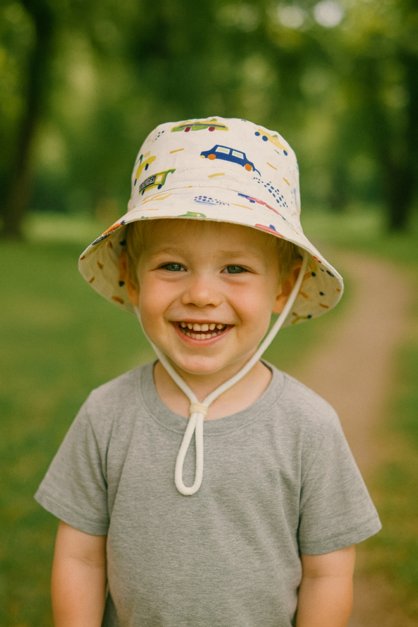The Transportation Adventure Hat is a playful kids’ bucket hat featuring colorful transportation illustrations like buses, cars, trucks, and road signs. Designed with a soft white base and cheerful vehicle prints, this hat brings a fun travel theme that kids love. The wide brim helps protect little faces from the sun, while the adjustable chin strap keeps the hat secure during outdoor adventures, park visits, and family trips.